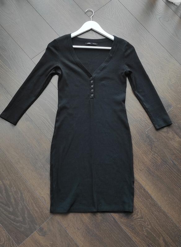 Жіноча трикотажна сукня в рубчик від SinSay, розмір М. Рукав 3/4, сукня тягнеться, гарно підкреслює фігуру. Стан нової Заміри: ПОГ 45 см, ПОТ 40 см, довжина 88 см. Склад: 95% котон, 5% еластан