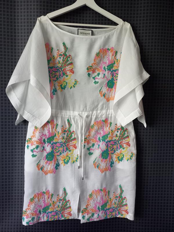 Платье от французского бренда.В составе 60% льна.Машинная вышивка,ткань полупрозрачная. Сзади есть маленькое пятнышко,еле заметное, девятое фото.Длина рукава от горловины 30см, талия 49см,длина91см