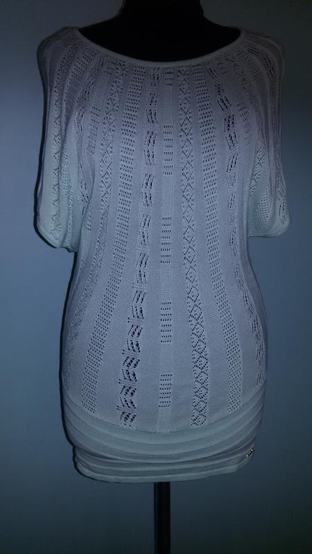 Прекрасная вещь! Может быть и платьем и туникой . Вязанная из тонких ниток ажурной вязкой. Длина по спинке-72,(ширина манжета по низу-15), длина рукава-25-26см,объем по низу-77(растягивается на нужный объем). По груди-прим 92-96. Одето на манекен размера ОГ-96, ОБ-100. Натуральная!- вискоза. цвет бледно-салатовый.