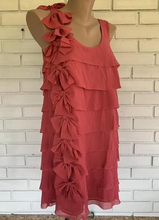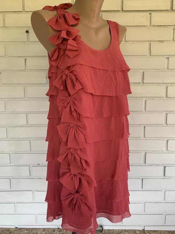 Нарядна сукня з воланами вільного крою, дуже легка. Приємного кольору, без явних дефектів. Невеличкий нюанс на останньому фото. Заміри Ог 46см довжина від плеча 81см