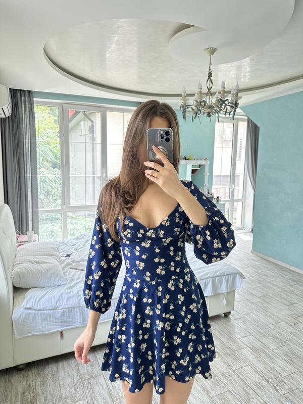 Синє міні плаття в квітковий принт Дуже гарно сідає , стан ідеальний Мої параметри : зріст 172 см Бюст 87 см Талія 66 см Стегна 91 см