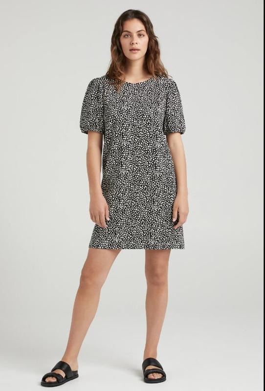 Стильна мінісукня/плаття у геометричний принт в чорно-білих кольорах від відомого британського бренду Marks& Spencer. Чудова якість тканини 95% віскоза. Тканина щільна та міцна, добре тримає форму. Класичний прямий крій, короткі рукави. Застібка ґудзик на спинці. Креативний принт: с далеку виглядає наче на чорному фоні білий горошок, але якщо придивитися, то це білі кубики різного розміру. Сукня ідеальна для походів в офіс. Особливо гарно вона буде виглядати з білими кросівками, кедами або туфлями "Мері Джейн" зі шкарпетками. Добре сідає на розмір 20 UK або 48 EU. Стан чудовий, без дефектів Розміри: плечі 45 см довжина 100 см груди 63 (126) см довжина рукава 24 см ширина рукава 20 см Доставка Укрпоштою або Новою поштою. Попередня оплата на картку Монобанку Обмін та повернення речей не передбачено