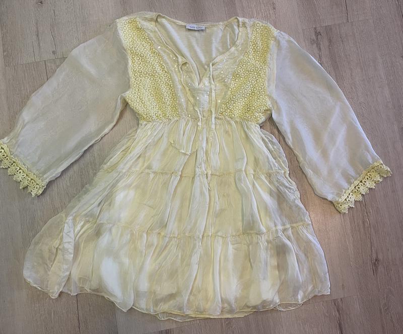 Неймовірно красиве плаття, ніжно-лімонний колір Привезти з Італії Проліт із розміром Дуже легке Довжина 75 Талія гумка 29-39 Рукав 43 Від пахви до пахви 38-50