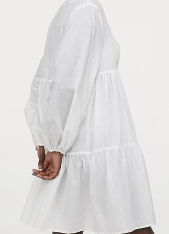 Коротка розкльошена пляжна сукня H&M з повітряного бавовняного попліну з глибоким V-подібним вирізом та рюшами для великої ширини та кривизни. Довгі рукави балони з вузькою гумкою на кінці. Без підкладки.