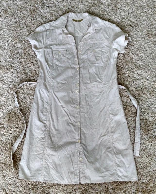 Літнє плаття з дуже легкої натуральної тканини молочного кольору. Можна носити як з поясом, так і без нього. Розмір вказано 14, але маломерит. Груди 48 Талія 44-45 Стегна 53 Довжина 88.