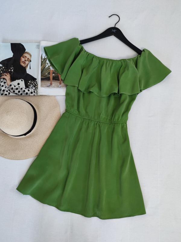 🌿зелена сукня від Mango з рюшею, талія на резинці, тканина віскоза, не просвічує Розмір:М Заміри:ПО грудей 47 см, ширина поясу 33 см, ПО бедер 54 см, довжина 85 см