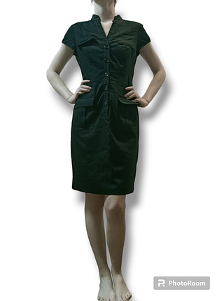 Маленькое черное деловое платье-стремянка от бренда H&М. Два накладных кармана. Без пояса. Есть запасная пуговица на ярлыке. Есть подкладка. Состав: 57% полиэстер, 41% вискоза, 2% эластан. Подкладка-100% полиэстер пог - 43см пот - 35см поб - 45см длина - 94см