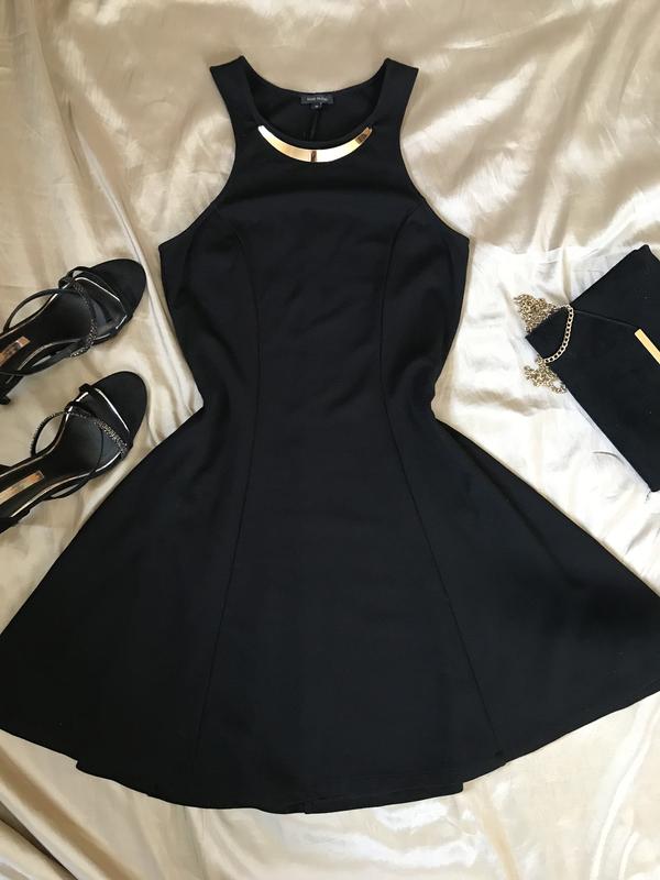 Стильна міні сукня із золотим півобручем, покрій сонцекльош, тканина стрейч. Довжина: 83см; півобхват грудей: 43см; півобхват талії: 36см;