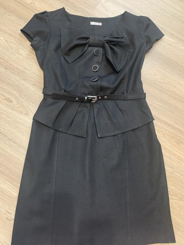 Платье чёрное нарядное с баской Спереди бант, застежка молния с боку, пояс в комплекте Размер М 44, подойдёт на S Рукав короткий Материал костюмный Очень хорошего качества ,без дефектов.