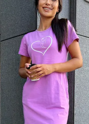 Чудова якісна сукня на літо, нова натуральна тканина кулір (бавовна), добре тягнеться, колір лаванда, є кишені. Принт мила кішечка з сердечком. Виробництво Україна.