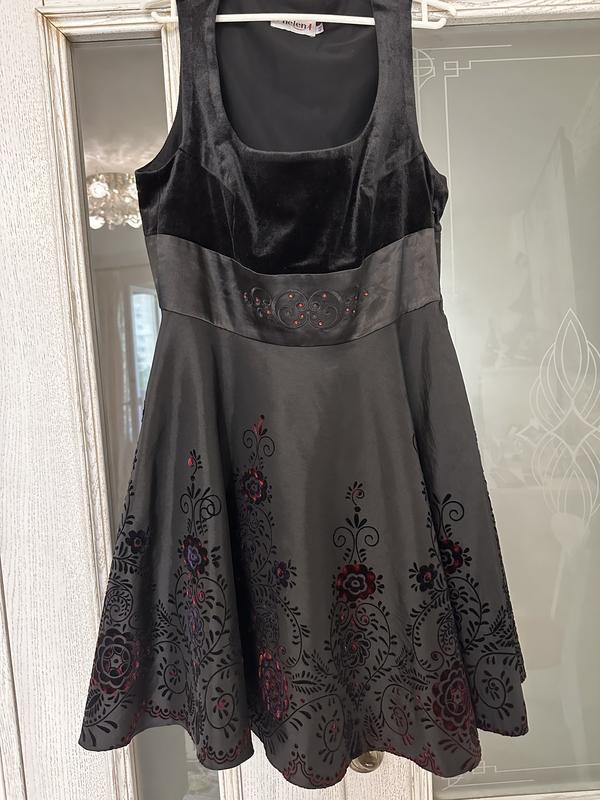 Сукня коктейльна дуже гарного фасону, верх оксамитовий ,а спідниця з тканини типу легка плащівка з набитим оксамитом візерунком , пояс атласний ,застібається збоку на блискавку. Сукня має підкладку.ПОГ 50см, ПОТ40см