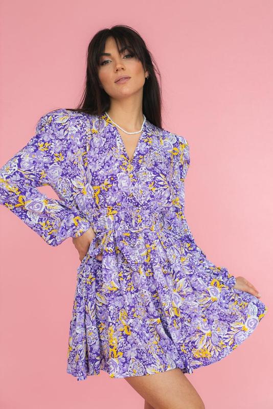 Плаття міні з підплічниками та яскравим принтом d-k basic — фіолетовий колір, розмір M, невелика Л.