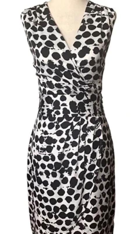 Дуже класна сукня в ідеальному стані. На грудях - на запах, низ - нижня спідниця та верх імітація на запах, на поясі - драпіровка (прошито), на спині - блискавка. Склад - 100% поліестер, тягнеться, сідає по фігурі ідеально, візуально збільшує груди, підкреслює талію та приховує невеликий животик. Тканина не тонка, гарно тримає форму. Довжина - 95 см., НОГ - 48 см., талія - 40 см., НОС - 52 см.