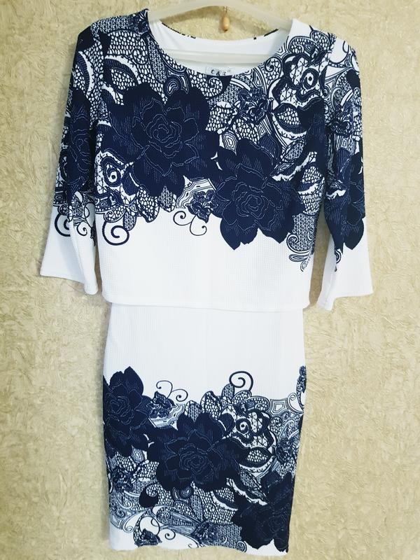 Плаття біле з темно синіми квітами, виглядає , як костюм. Рукав 3/4.