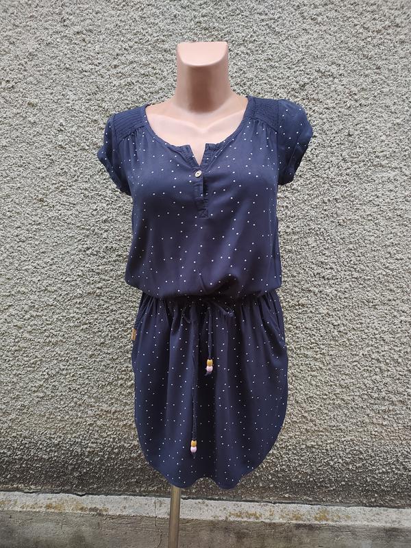 Короитка сукня Ragwear темно-синього кольору в дрібний горошок. Пояс на зав'язках. Матеріал: віскоза. Розмір XS, підійде також на S. Заміри: пог 43см, пот 38см (на резинці), пос 53см, довжина 83см. Відсутній один верхній гудзик (брендовані). Має дві бічних кишені.