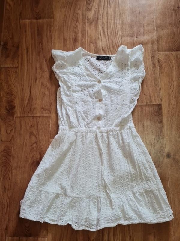 Летнее платье из прошвы.От плеча волами которые спускаются к талии. На поясе резинка.Спереди на пуговицах.С подкладкой.Коротка.Оденета один раз.
