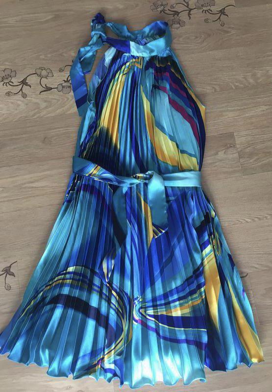 Яскраве гофроване плаття, без рукавів, зав'язується на шиї, вільного крою (підійде на будь-яку фігуру), є пояс, довжина 90 см. Це яскраве повітряне плаття можна одягнути на будь-який захід, зокрема й на випускний), розмір S, M Склад: 97% poly silk,3% elasticity