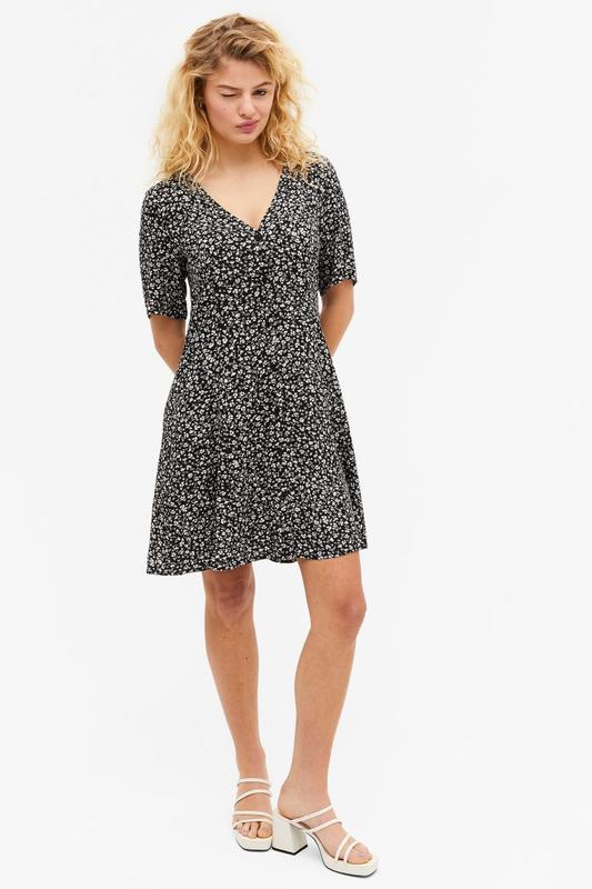 Оригінальна фірмова сукня з паперовою біркою! Коротка, дещо приталена сукня із щільного крепового джерсі з малюнком. V-подібний виріз горловини, декоративні гудзики спереду та рукав довжиною три чверті. Без підкладки. Склад: 96% поліестр 4% еластан Заміри: напівоб'єм грудей - 35 см напівоб'єм по талії - 31 см напівоб'єм стегна - 45-46 см напівоб'єм по самому низу - 58 см довжина від плеча – 86 см плечі – 33 см рукав від плеча/внутрішній шов - 45 см/31 см матеріал тягнеться