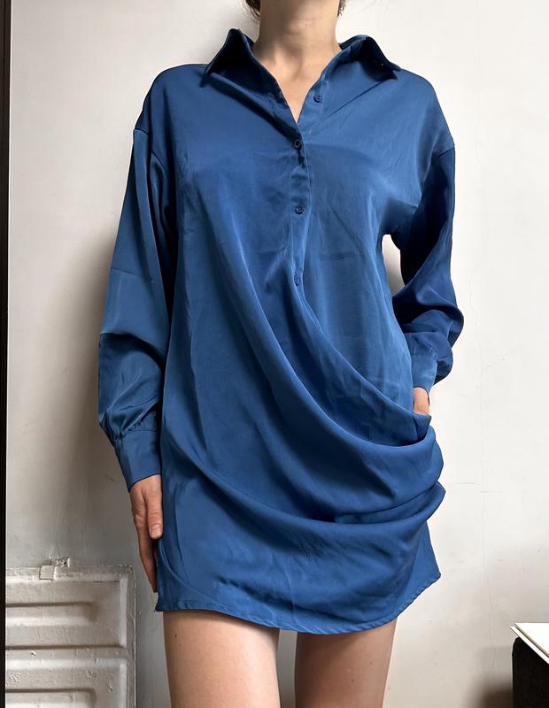 Синю атласне плаття-сорочка. Розмір m