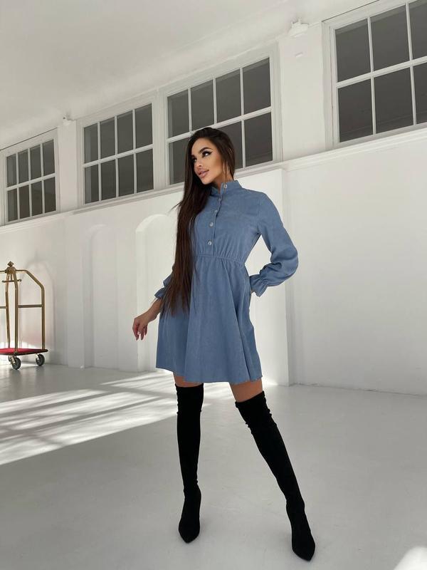 Размер: S-M, L-XL Платье Мод 646 Ткань - Микровильвет на натуральной основе Цвет - малиновый, джинс Пуговицы функциональные Талия на резинке По бокам карманы Длина 89 см