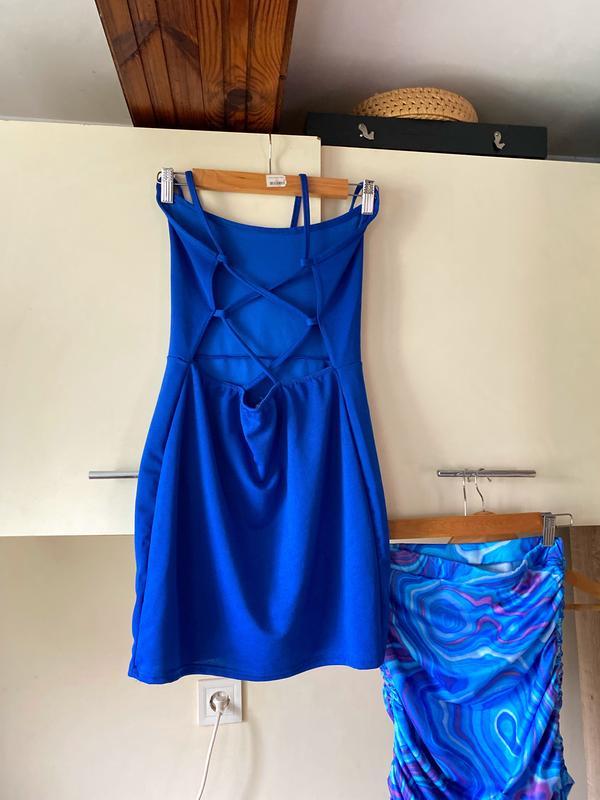 Сукня міні синя, коротка сукня синя, сукня на шнуровці, сукня синя з відкритою спинкою