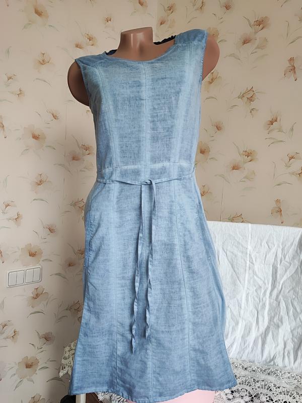 Чудове легке літнє плаття без рукавів. По спинці на замку, чудово сідає на фігурі. Тканина натуральна, приємна до тіла — тонкий бавовняний трикотаж і тонкий льон. Трикотаж із боків і кокетка по спинці. Ніжного блакитного кольору. Має дуже ефектний та стильний вигляд. ПОГ-ПОТ-НОС 46-40-52 см. У плечах 38 см. Довжина по спинці 95 см. Спереду дві невеликі внутрішні кишені.Сстань ідеальний. Дефектів немає.