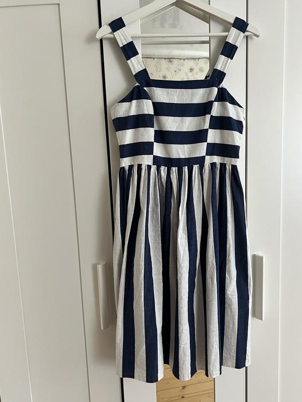 Класне плаття в смужку від Atmosphere розміру 38 М Ідеально підійде на теплу пору року Гарне і легке Є підкладка в зоні грудей Не просвічує!!!! На спинці гарний виріз Склад 100% бавовна Заміри: Груди 38 Талія 35 Довжина від бретельок до спідниці 37 Довжина всього плаття 95