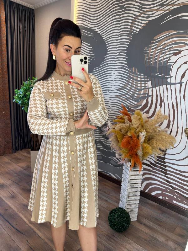 ДИВОВИЖНО КРАСИВА СУКНЯ ПРИТАЛЕНОГО СИЛУЕТУ ВИКОНАНА З ЯКІСНОГО ТРИКОТАЖУ МАШИННОЇ В'ЯЗКИ З ЕФЕКТНИМ ПРИНТОМ, ПРИКРАШЕНА ПРИШИТИМИ ЗОЛОТИСТИМИ ҐУДЗИКАМИ ДОВЖИНА РУКАВА ВІД ШИЇ 75 СМ ДОВЖИНА ВИРОБУ 100 СМ РОЗМІР ЄДИНИЙ 44-46 КОД 0410