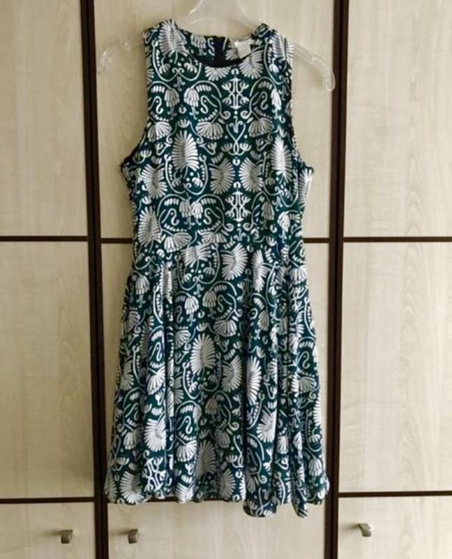 Плаття з віскози в цікавий принт. Довжина по спинці 90 см, по грудях 44, по талії 36, спідниця широка. Є нюанс — кілька дірочок по низу спідниці, абсолютно не видно в носінні завдяки кількості тканини по спідниці та забарвленню. За бажання можна вкоротити на парі см. В ціні враховано. В іншому стані нової речі. Є підкладка