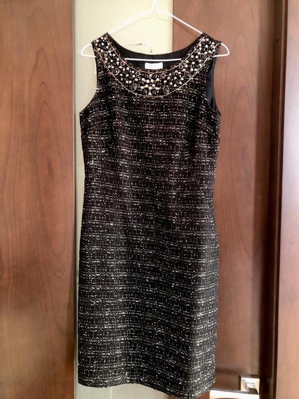 Сукня Monsoon , в стилі Шанель . Дуже гарна і елегантна. В складі віскоза, небагато вовни. Має легкий блиск, але не вульгарний. Збоку «блискавка», на підкладці . Стан ідеальний . Розмір 38 (м), але краще на S. На останньому фото цінова політика бренду, сукні від 3500 гривен. Довжина - 90 см. ПОГ - 44 см. Пот- 39 см. Поб- 48 см.