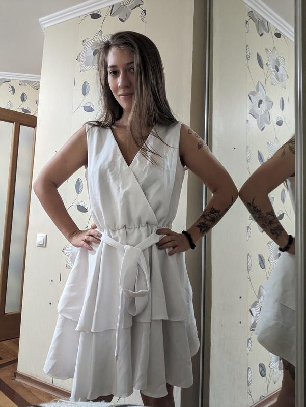 біла сукня з поясом і рюшами