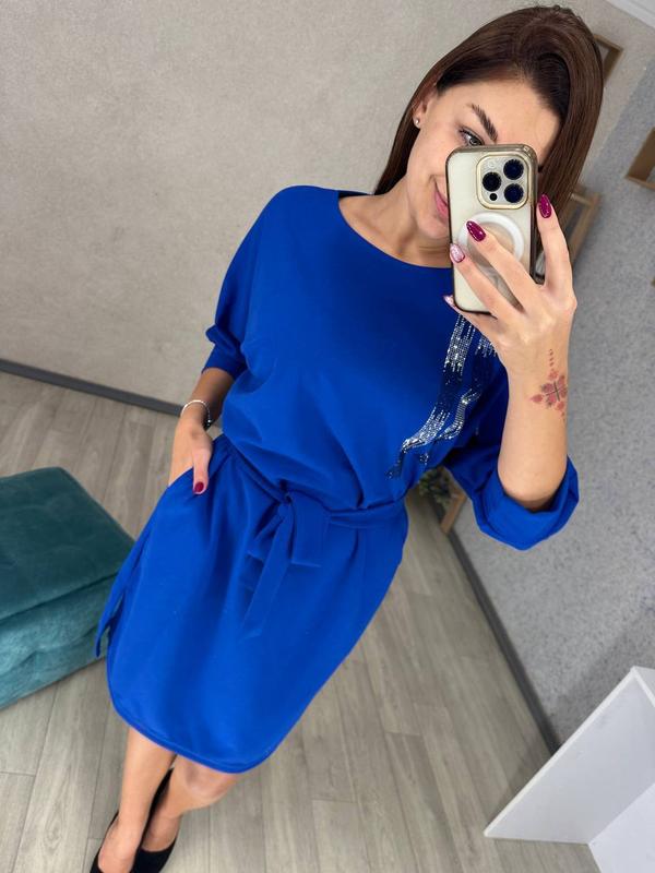 Відправка післяплатою здійснюється з передоплатою на карту 150грн (Нова пошта) Сукня виконана з креп дайвінгу Має яскравий та якісний декор з камінчиками страз Рукав 3/4 Верх сукні вільний Чудово лягає по фігурі і приховує всі недоліки...якщо вони є! У такому елегантному платті Ви будете почувати себе комфортно на будь-якому святі чи корпоративі, та у повсякденному житті Розміри 44-46, 48-50,52-54,56-58 На модели 44-46 р Довжина 95-97 см ПОГ 55 ( вільний ) ПОБ 51 см До кожного розміру + 6 см по обсягах