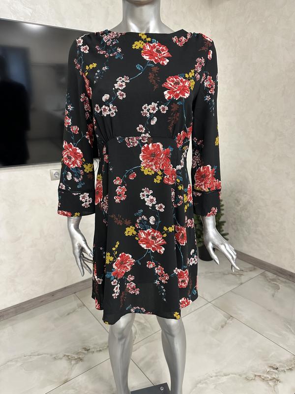 Дуже красиве плаття у квітковий принт, нове. Розмір 14. Заміри: довжина 88 см, пог 53 см, піт 43 см, б 59 см, рукав від шва 51 см. Тканина тягнеться.