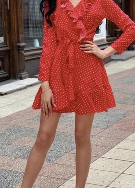 Біля коротка сукня в горох з рукавом. На тілі виглядає, як на першому фото. Розмір S.