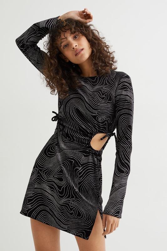 Розмір М (довжина 88 см,пог до 48 см,поб до 48 см.) Коротка трикотажна сукня з довгими рукавами, декоративними вирізами на лаштунках з боків і розрізом з обох боків знизу.