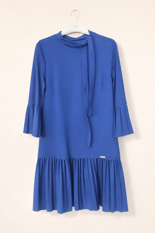 плаття жіноче кольору електрик. низ плаття і рукава плісе. горловина круглий виріз з декоративною зав'язкою. довжина на ріст 162 см по коліно. розмір С/М.