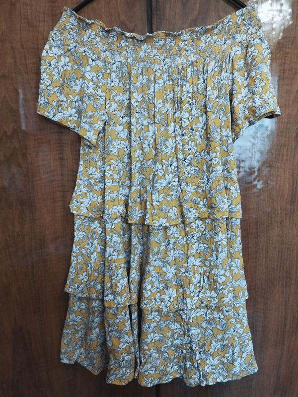 Гарненька сукня з рюшами. Можно носит з вiдкритими плечами. Дефекти та слiди носки вiтсутнi