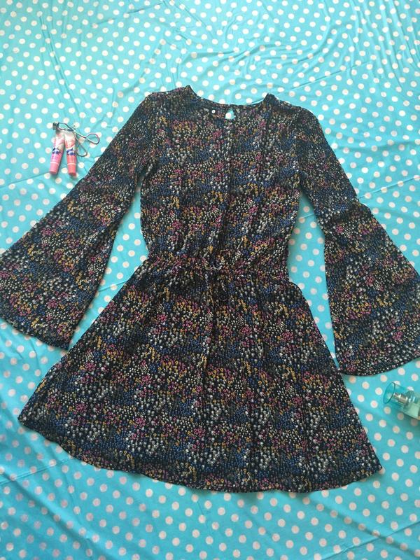 Нежное шифоновое платье с длинными рукавами-клеш! Очень красивая модель. Хорошо сядет на различные типы фигур за счет возможности регулировки объема талии завязкой. Синтетическая подкладка в виде комбинации защитит Ваше белье от взглядов окружающих. Длина - 92см Плечи - 40см Хорошо сядет на M-L.