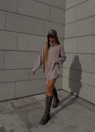 Уютное платье свитер оверсайз; Выполнено из теплой, очень приятной к телу ангоры рубчика; Модель Прямого кроя с небольшими разрезами по бокам; Имеет высокий воротник с подворотом;