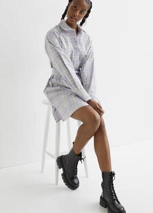 Размер S и L ( 100% хлопок) Платье-рубашка из хлопковой ткани с воротником, потайными пуговицами спереди, низкой линией плеч и длинными рукавами с манжетами на пуговицах. Съемный пояс на талии.