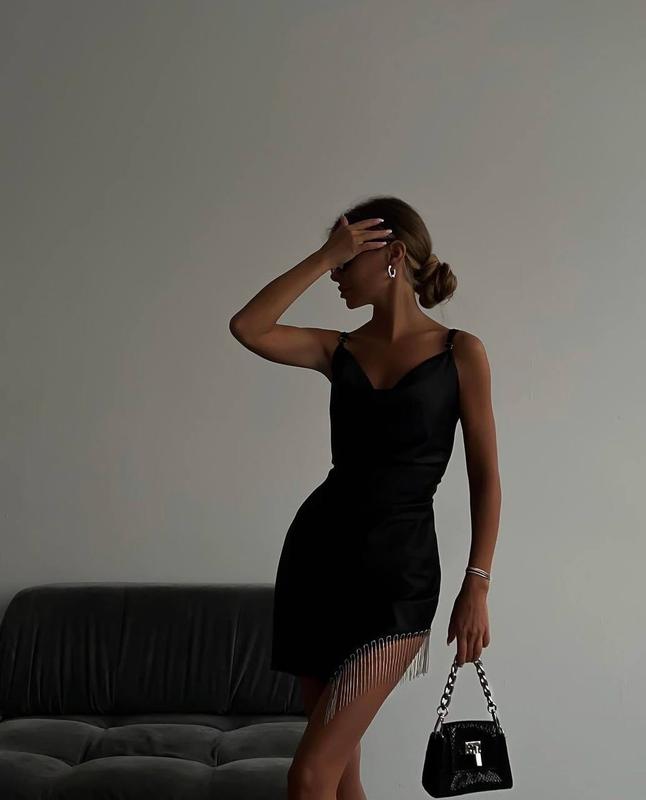 Сукня ⠀ ▫️Кольори: чорний ▫️Розміри: 42-44, 46-48 ▫️Тканина: щільний атлас ⠀ Ідеальне міні, яке не залишить тебе без уваги. Щільна тканина та металева бахрома. Лямки можна регулювати. ⠀ Модель 264