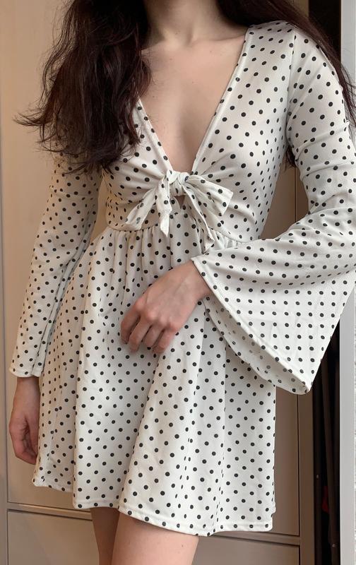 Сукня в горошок PLT. Ззаду на спідниці та під руками трохи затерта тканина, але при носінні не помітно (за потреби можу скинути фото) Заміри Довжина 72см Рукав 55см Талія 33см +резинка+завязки Груди 40см +завязки Одягнено на параметри Ріст 164 Ог 82 От 62 Об 92 За питаннями, додатковими фото - звертайтесь)❤️
