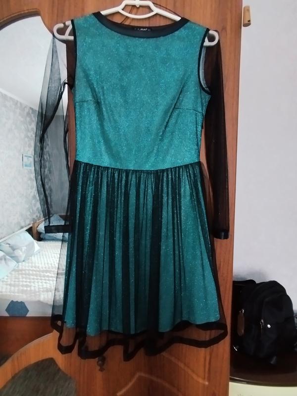 Новое нарядное платье, одетое всего один раз,цвет зеленый с блестками, нежнее сеточка, к ней идет кожаный поясок фото на себе добавила,там цвет более яркий,такий же в живую. замеры: размер 44 Длина 87 см Полу обхват груди 40 см Длиной рукава от плеча 58 см Ширина плечей 36 см