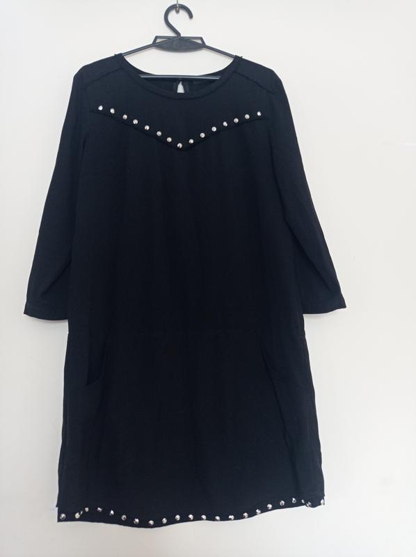 Стильне коротке плаття,рукав тричетвертв,ззаді замочок,підкладка.Спереду кишеньки,довжина від плеча 87см,треба випрати бо запилючене,колірчорний