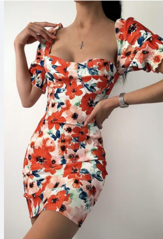 Гарна сукня по фігурі еластична принт квіти 14 хл Довжина без плечей 66 Напівобхват грудей 44 плюс трохи тягнеться Талії 38 плюс Стегон 43 плюс Низ 43 плюс 95 поліестер, 5 еластан