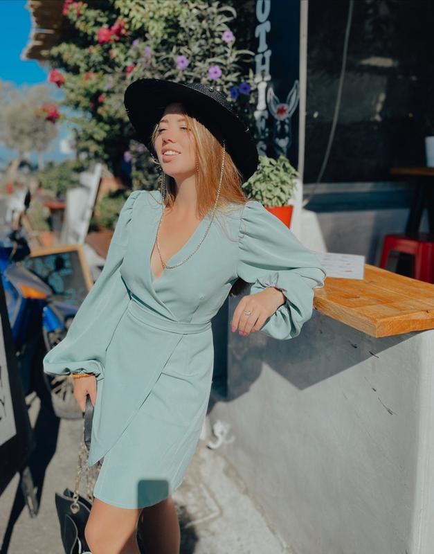 Сукня назапах з об'ємними рукавами,які не втрачають форму, внизу резинка М’який бірюзовий колір, ближче до оливкового Разом з поясом