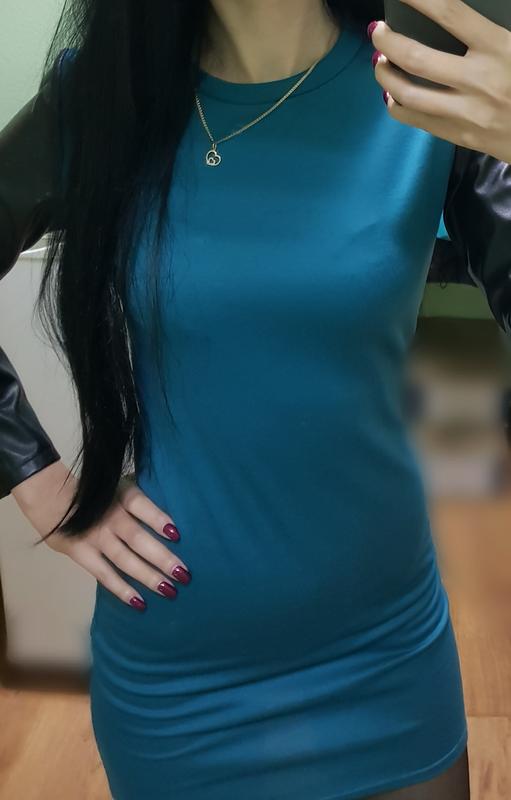 Сукня зеленого кольору трикотаж зі шкіряними рукавами. Стан ідеальний. Виміри: по плечах 36, груди 40, талія 35, стегна 40, довжина 81, довжина рукава 56.