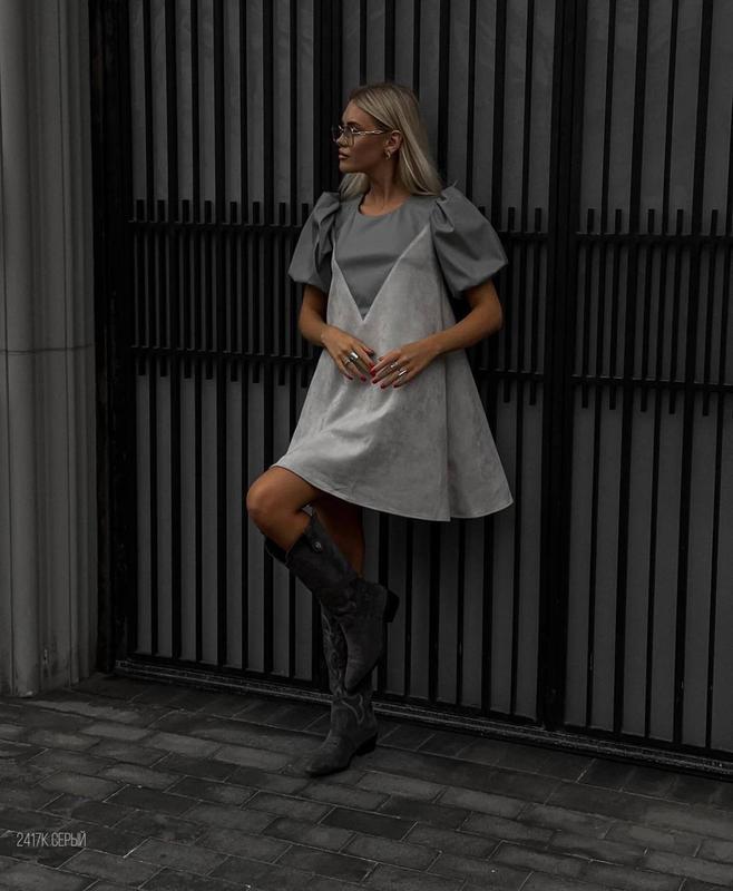 Сукня Модель 5459 ▪️Ціна 990грн Розміри 42-44,46-48 Тканина еко шкіра та замш Колір стальний Стильний дизайн, милий крій та поєднання одразу двох тканин (екошкіра + екозамша) - роблять незабутнім цей образ