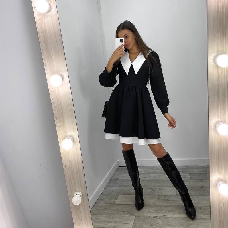 Арт 1464-394 Ефектна та ошатна сукня міні з акцентом у вигляді білого коміра. Ця сукня підкреслить вашу фігуру і зробить ваш образ незабутнім Сукня Ціна: 990 грн Розміри: 42-44, 44-46 Тканина: костюмка+котон Колір: чорний Сукня як на фото з підʼюбником