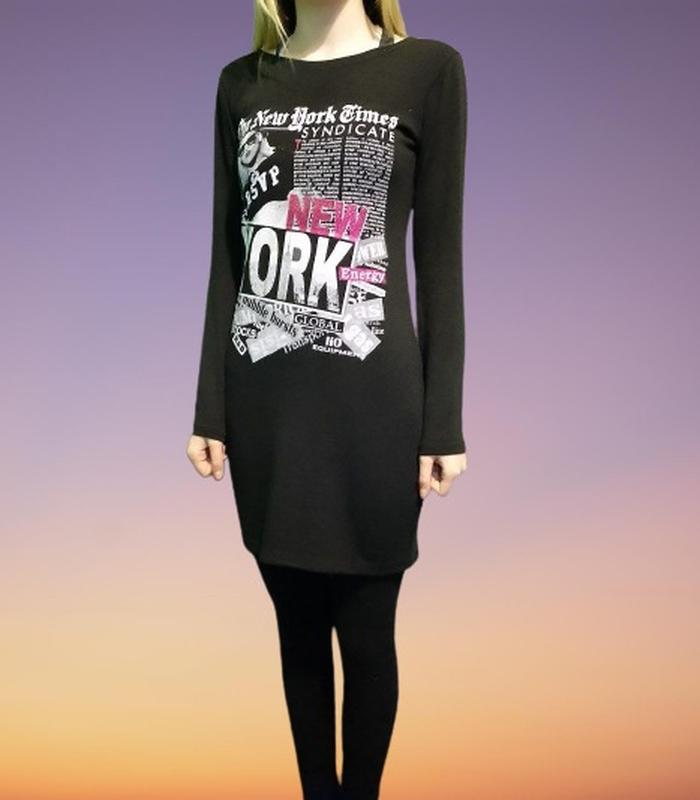 Сукня жіноча чорного кольору з малюнком.Розмір 1 підійде на S і M.Заміри: довжина -77 см,н.о.бюст-39( тягнеться до 50 см), н.о.талія-35( тягнеться до 43 см), довжина рукава -54 см.